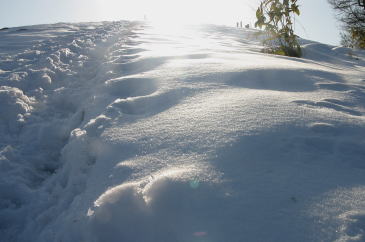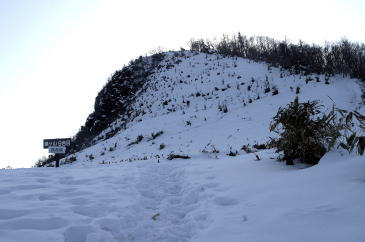 | できればスノーシューで歩きたかったがご覧のとおり。 上の2枚の写真の上にマウスポインタを置くと2005年12月29日の山の様子がご覧になれます。 できればこんな日に歩きたいなぁ。 6合目手前の急登では雪解けでぬかるんだ黒ぼこの土でよく滑り、何度も転倒しそうになった。 |