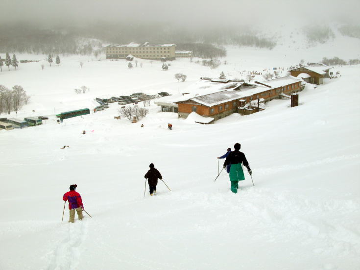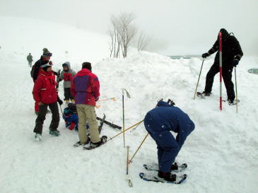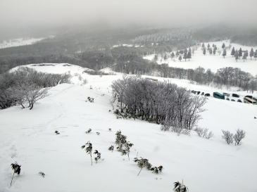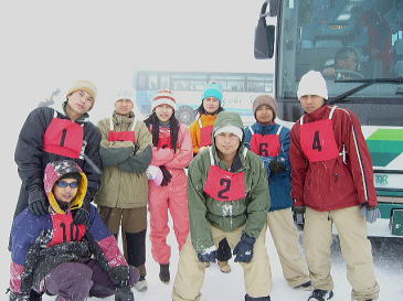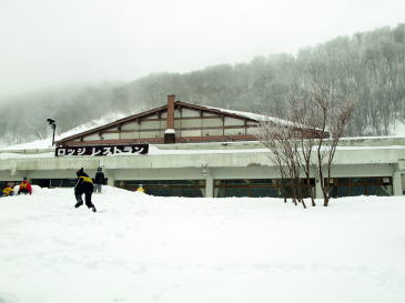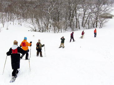 | タイから来日している10名の研修生たちが雪遊びをしたいというので、日帰りスキーツアーに参加することにした。 来日している彼らは母国で雪を見たことがない。 今日は彼らにそり遊びや雪合戦などを楽しんでもらって、思い出の1ページを作ってもらえたらいいなぁ〜なんて思っている。 とは言っても、こんな時でも時間があれば雪山歩きもしてみたいと秘かにスノーシューを持参してしまった。 バスツアーの数名の方がスノーシューハイクを希望されていることを知り、 研修生たちがそり遊びを楽しんでいる間にご一緒させていただくことにした。 皆さんスノーシューは初めてだというので先頭を歩くことになってしまった。 研修生を放置したまま数時間も歩くことはできないので、ロッジから2時間もあれば往復できる擬宝珠山(1,110m)を目指すことにした。 ロッジ右側の尾根を忠実に辿れば稜線に出るとフロントで教えられ、後ろ髪を引かれる思いで歩き始めた。 みんなごめんね。 |