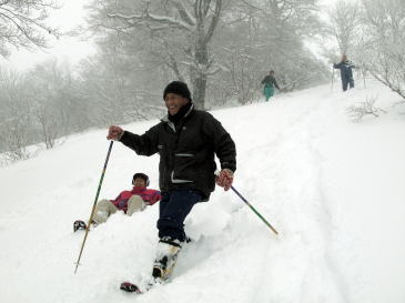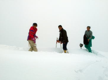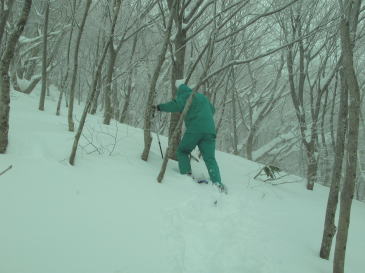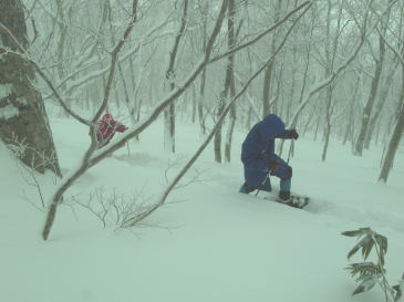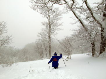 | トレースがないので最初からラッセルだったが、途中で先頭を代わってもらいながら1時間ほどで楽に稜線に出ることができた。 この日は朝から間断なく雪が降り続き、稜線上にはガスもかかっていて展望は全く利かなかった。 それでもスノーシューハイクは楽しいと、皆さんに喜んでもらえた。 とてもうれしい。 |