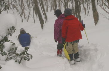 | 下山時にやっとスノーシューの出番がやってきた。 登山道をどんどんショートカットしながら下って行けるので実に楽しい。 あっという間に駐車場まで下りてきてしまった。(ちょっと大げさかな?) |
