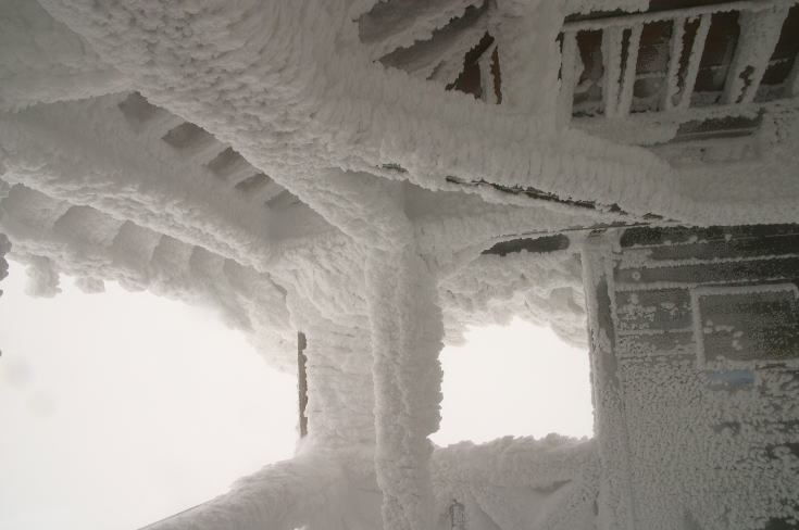 | 下山はCコースを戻ることにして東屋に立ち寄ってみた。 中の様子を見て驚く。 羽毛状に成長した霧氷は内部を覆いつくし、東屋はまさに凍てついていた。 |