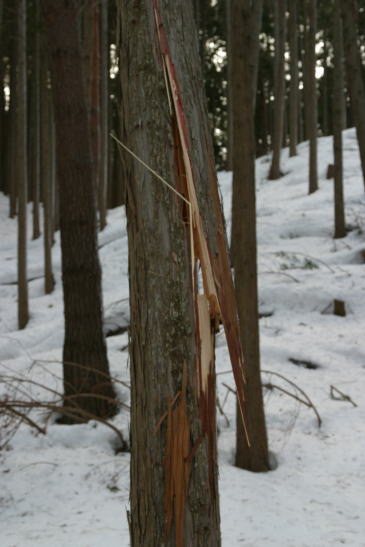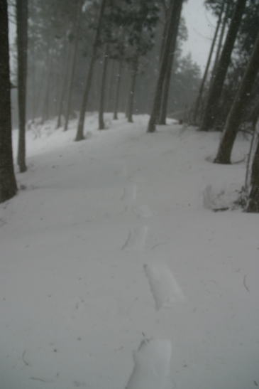 | 山頂手前から吹雪になってしまった。 強風に耐え切れなくなった一本のヒノキが目の前で「バキ、バキッ」と大きな音を立ててへし折れた。 あちこちでヒノキの折れる音が響き渡っていた。 徐々に視界が悪くなり、これ以上先に進むのは危険だと判断して山を下りることにした。 20〜30分前のトレースが吹き消されていくから恐ろしい。 |