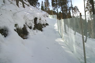 | 登山口 | しばらく樹林帯を歩くと獣よけのネットが張られている。 ときどき青空ものぞいたが・・・。 |