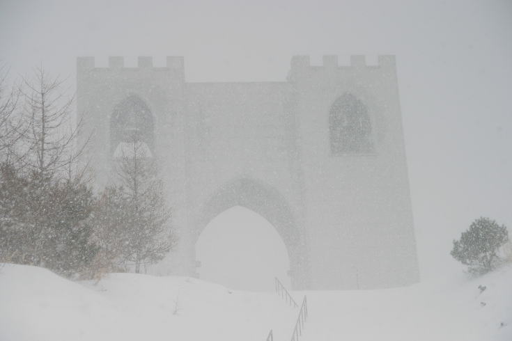 | 日名倉山中腹にある「リュバンベールの鐘」 除雪されていたので下山後ベルビール自然公園まで車を走らせてみた。 やっぱりこの建造物に似合うのは抜けるような青空だな。 鉛色の空を見上げてそう思った。 |