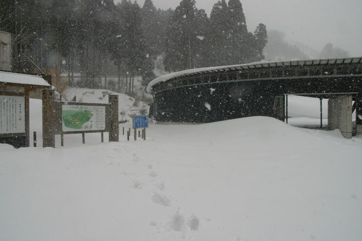 | 久しぶりに日名倉山を歩こうと車を走らせたが、ビジターセンターに着く頃になって激しく雪が降り出してきた。 じっと車の中で天候の回復を待ち、小康状態になったところで歩き始めた。 東粟倉美しい森ビジターセンターの積雪は30cm程度、トレースはないが何度も歩いているので迷うことはないだろう。 |