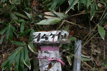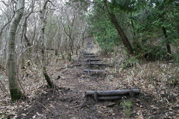 | 蒜山三座を縦走しようと出かけたが、風邪のため体調がすぐれず蒜山をあきらめて, これまで一度も歩いたことのない仏ヶ仙を歩くことにした。 登山ガイドブック「岡山の山百選」を頼りに車を走らせるが、なかなか登山口を見つけることができなかった。 目標にしていた林道完成記念の木標と登山口の立て札は今では朽ち果てて根元から折れしまい、むなしく側溝に横たわっていた。 さらに登山口の階段も落ち葉と笹に隠れていて、登山口とわからずに見過ごしてしまったようだ。 |