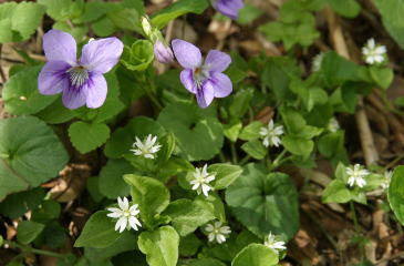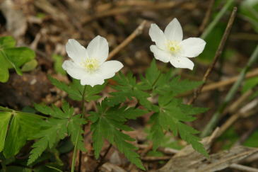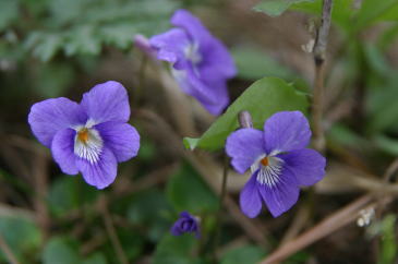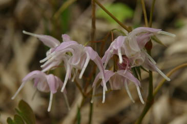 | しばらく歩くとイチリンソウが満開を迎え、トキワイカリソウやスミレも出迎えてくれた。 特にイカリソウは登山道の至るところに咲いている。 |