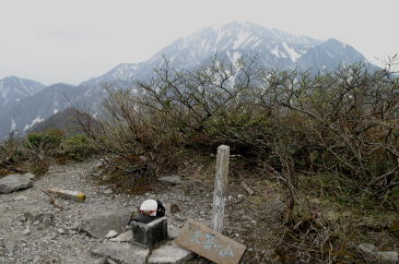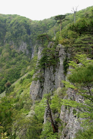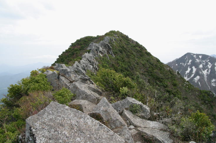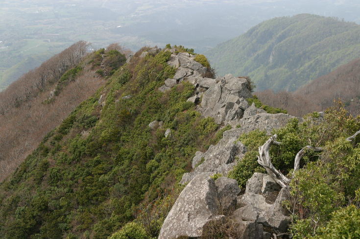 | 歩いて来た岩稜帯を振り返る。誰か歩いていればこの迫力のロケーションが伝わるのだけど・・・。 そういえば今日、まだ一人の登山者にも出会っていないことに気がついた。 GWなのでかなり込み合うと思っていたのに・・・。 込み合うのは困るが、まったく人に出会わないのも少し寂しいものだ。 |