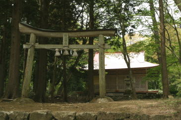 | 山奥にひっそり佇む船上神社 (AM11:15) | 神社の脇を進むと延々と新緑の森が続く。 さわやかな風と小鳥のさえずりがとても心地いい。 |
