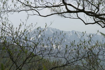 | 長い長い勝田ヶ山までの道のり。 途中簡単に昼食をすませて歩き続けると、 やがて樹間から大山が見えてきた。 |