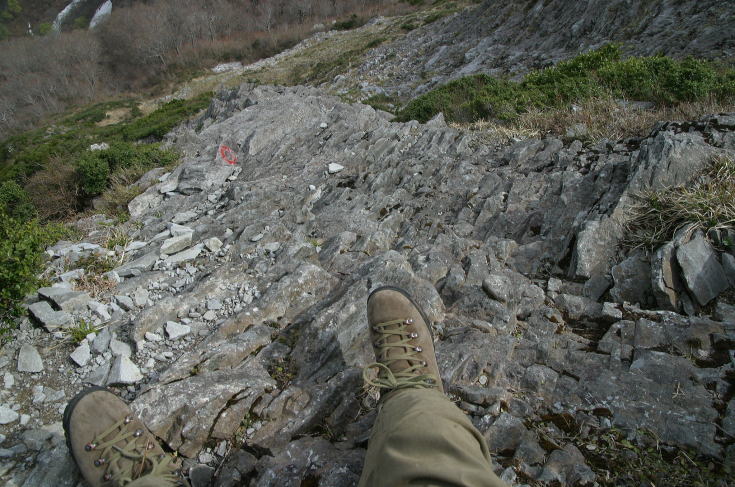 | 甲ヶ山を下る ここはかなりの傾斜があり、油断できない。転落すればただのケガではすまないだろう。 赤い目印に導かれて慎重に岩場を下って行く。 |