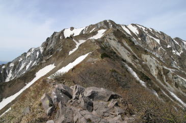 | 砂滑りから元谷に下山するつもりでいたが、強風のためか落石の音がいつも以上にひどかった。 それに砂すべりの状態も不安だったので上宝珠越から下宝珠越へと下山することにした。 |