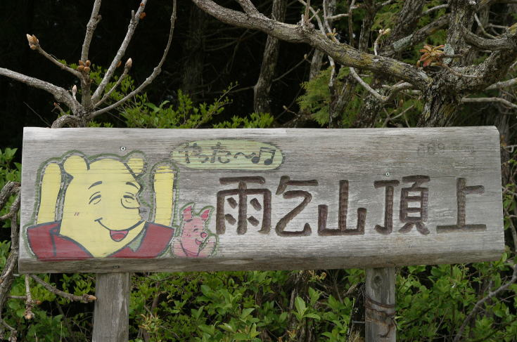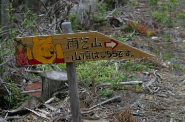 | 登山道をしばらく歩くと風倒木の被害を受けた山肌が現れる。 | 熊のプーさんが山頂まで親切に案内してくれた。 | |||||||