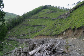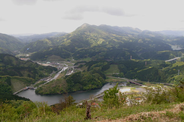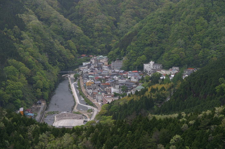| 湯原温泉街を俯瞰する。 歩き始めて約50分。ようやくハゲ山が自然林に変わった。 雨乞いした覚えなどないのにこの辺りから雨が降り出してきた。 |