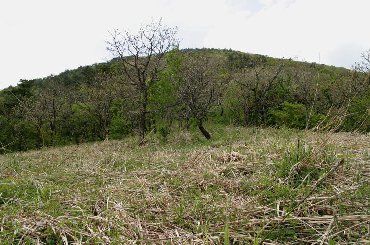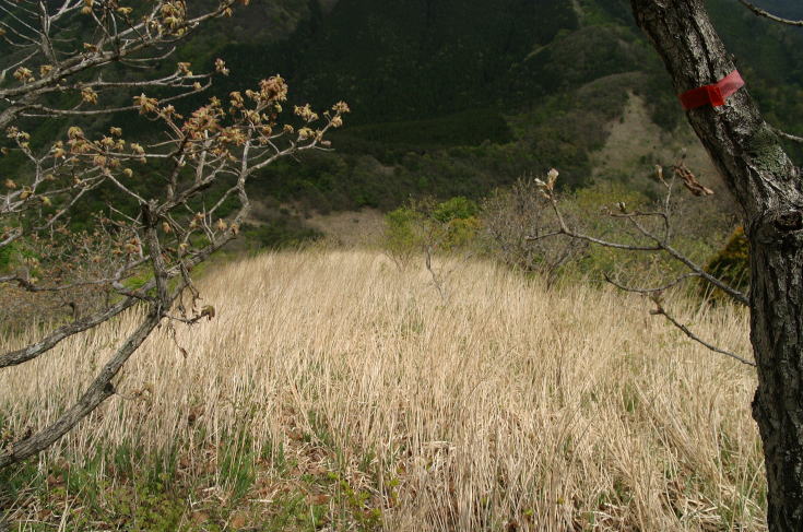 | 山頂から往路を100m程引き返すと進行方向の左側に赤いテープが確認できる。 ここからヤブに突入するが、思っていたほどではなかった。 これならルートを外さずに歩けそうだ。 |