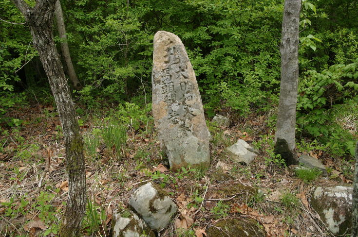 | カヤの原っぱの一角に石碑が建っていた。 登山道のない場所に建ち人目に触れることのない石碑だが、以前はこの辺りも人々の生活圏の中にあったんだろうな。 |