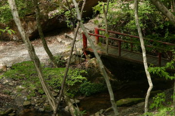 | ヤブを漕ぎながら山頂から約1時間。沢の音が近づいてきたと思ったら突然目の前に赤い橋が現れた。 ようやく古屋不動滝に到着したのだ。 |