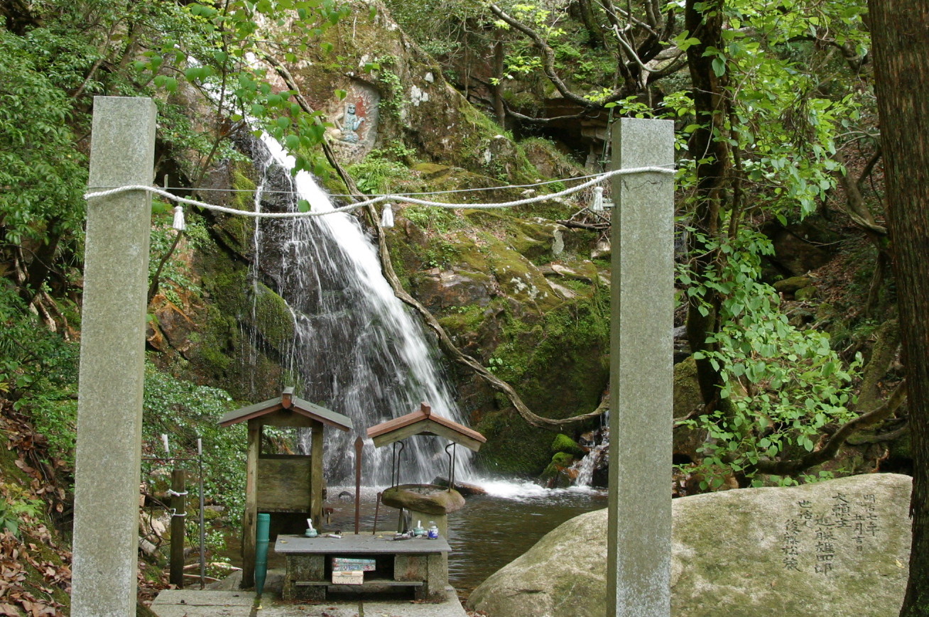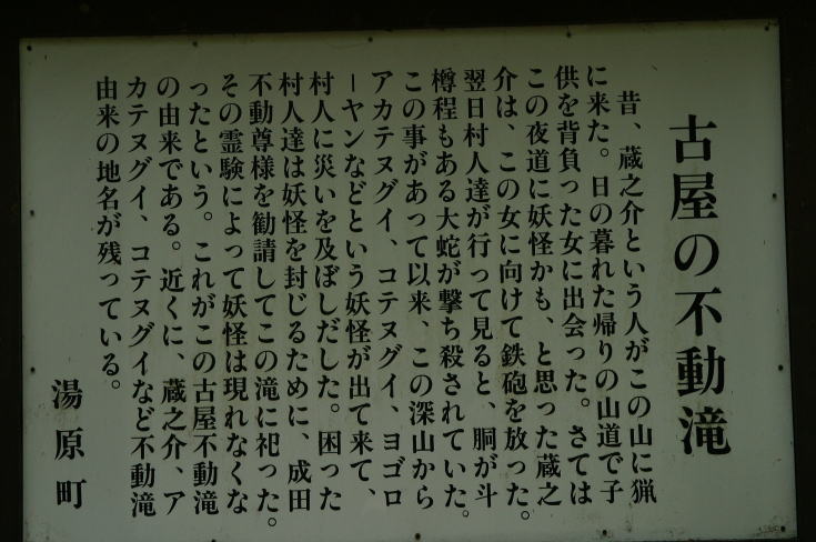 | 古屋不動滝 上の画像にマウスポインタを置くと岩壁に彫られた不動明王が現れます。 |