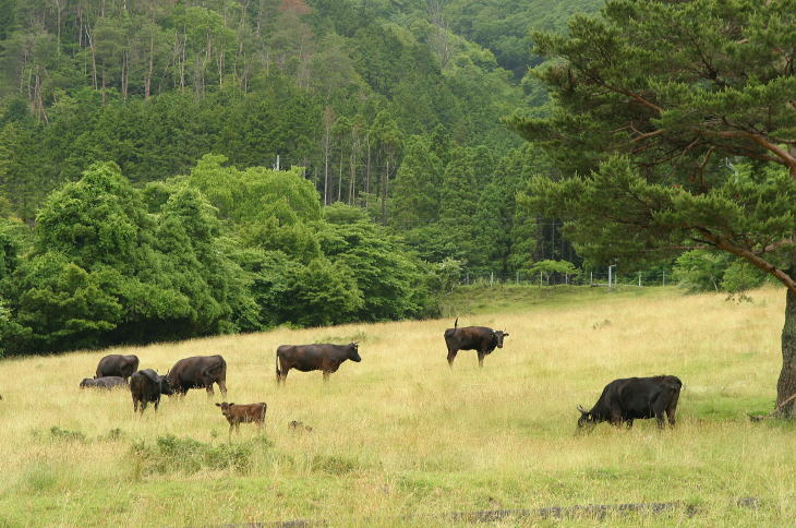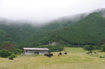 中土居のバス停{大ヶ山口(ダイガセングチ)」を西に進むと やがて今はもう営業をやめたレストハウスに到着する。 レストハウスから広がる牧場では放牧された牛がのんびり牧草を食べていた。