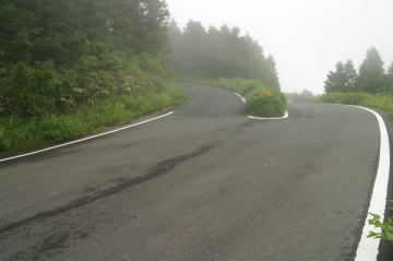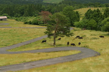 アスファルトの道が牧場の中央をつづら折りに伸びている。