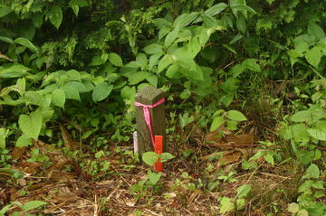 ここが山頂なんだろうか。 (AM11:05) 100mほど歩くとピンクの鉢巻をした石柱が立っていた。 展望は全く利かない。 |