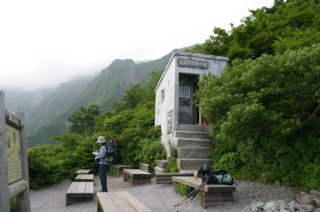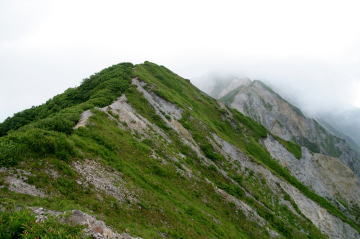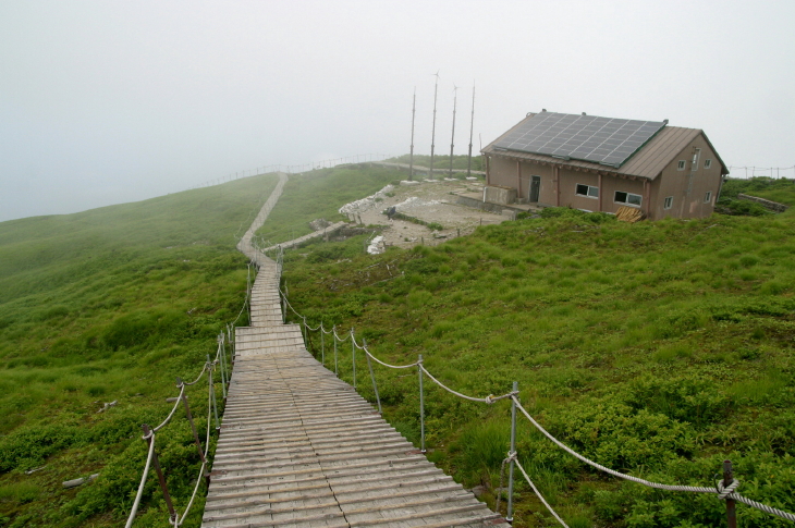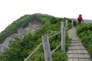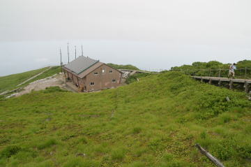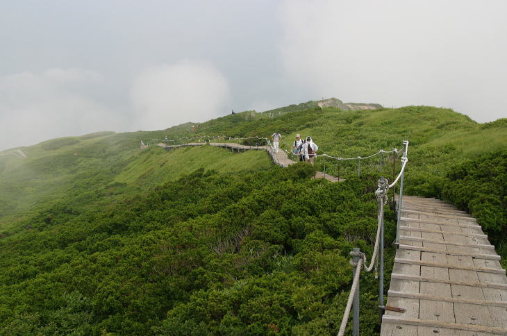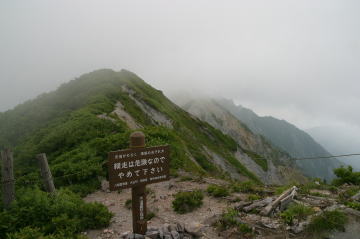 | 延々と続く木道 | 縦走路はガスって剣が峰は望めなかった。 | ||||