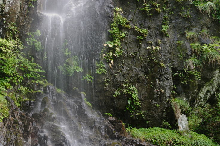 滝のしぶきを受けながら岩場で可憐に咲くイワタバコ。