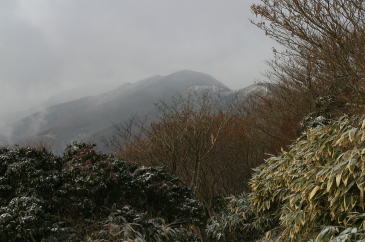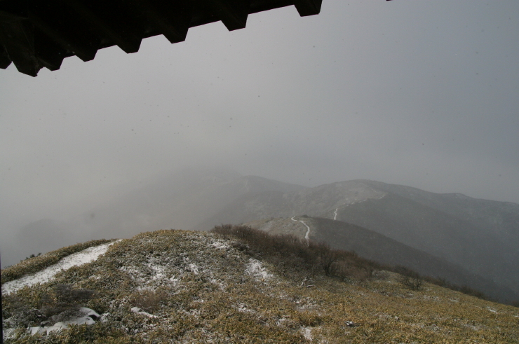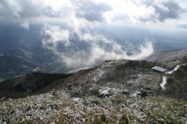 山頂に向かって歩いていると一組のご夫婦に声をかけられた。 昨年の元旦にグループで来られていた神戸のお二人だ。 非難小屋で楽しく話をさせていただいた上、何やらご馳走になった ことが記憶によみがえった。 その節はお世話になりました。 今年も初登山に私と同じ山を選ばれたんですね。 来年もまたこの山でお会いできるような気がした。 山頂付近はガスっていて展望が利かなかった。 このため非難小屋でゆっくり食事をして晴れるのを待つことにした。 予想外に非難小屋は無人だった。 駐車場にあった車の方々はすでに下山したようだ。 |