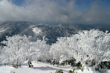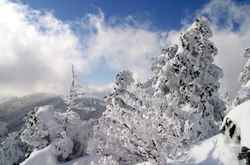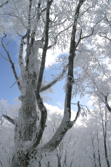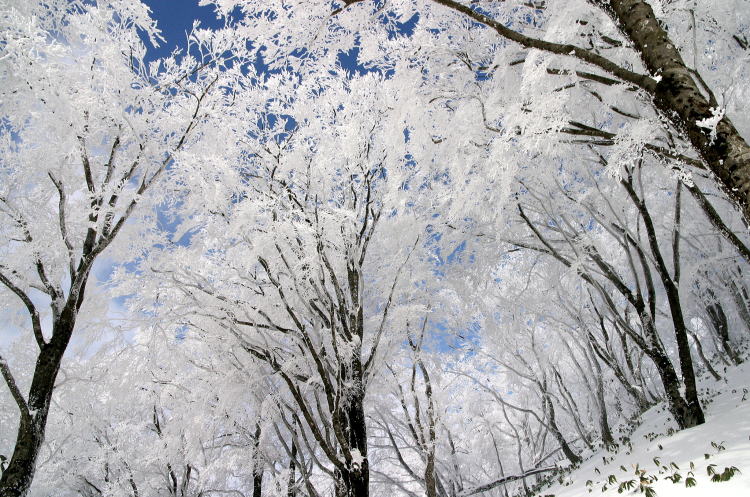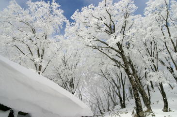 青空に映える見事なブナ林の樹氷 |