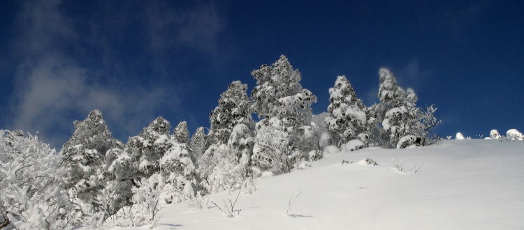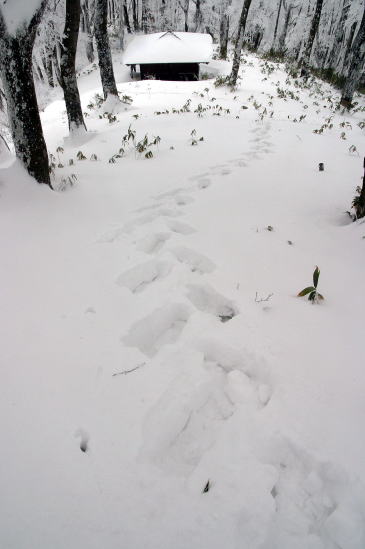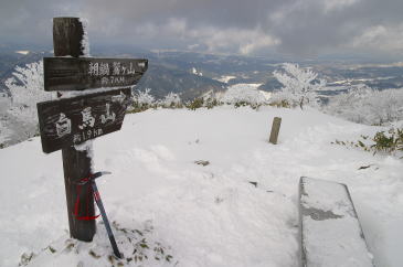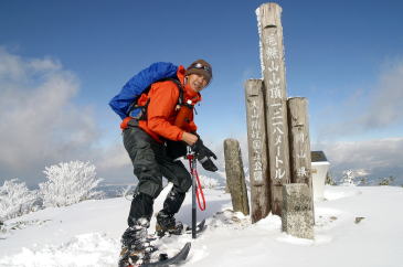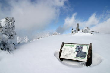 非難小屋から山頂までは目と鼻の先だ。 ところが一段と深い積雪と雪の重みで垂れた樹木が行く手を阻み なかなか前に進めない。 悪戦苦闘しながら登り続けて視界が開けた瞬間、 何物にもかえがたい達成感がわいてきた。 山頂付近は強風のためか思ったほどの積雪ではなかった。 残念ながら大山は雲に隠れてその姿を見ることはできなかったが 素晴らしい景色に感激した。 当初は白馬山まで縦走しようと思っていたが、 もうそんな体力は残っていなかった。 しかしもう十分に満たされていた。 |