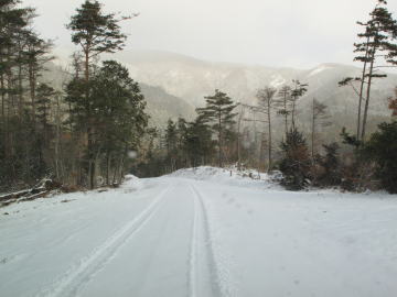 積雪の車道にはすでに車両の跡が残されていた。