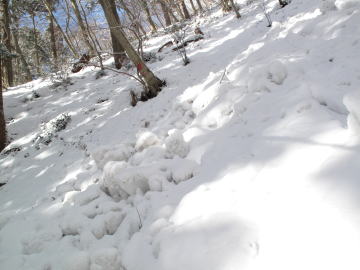 この頃から時おり銃声が響き渡るようになった。 自衛隊の演習なのかイノシシを狙う猟師が放つ銃弾の音なのかは不明だが、とても不快な音だ。 締まった雪の上に新たな積雪があったためか、急峻なところではあちこちで小規模な表層雪崩が起こっていた。
