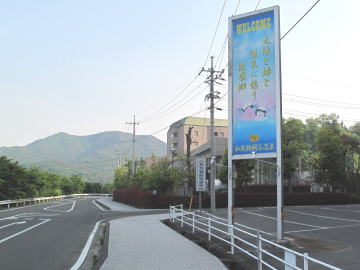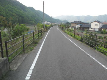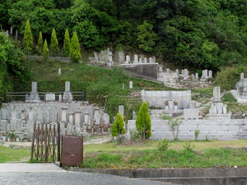 鵜飼谷温泉から300mほど南下すると点滅信号があるが、その手前左側に伸びる遊歩道に入る。 遊歩道を約1km進み北川病院を過ぎると山すそに墓地が見えてくる。 |