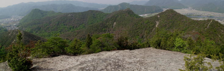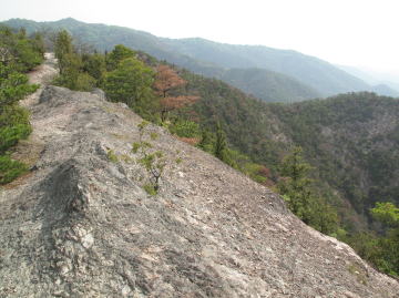 間ノ峰からさらに稜線を進み岩稜を登りつめて振り返ると、和気富士から続く歩いて来た山並みが一望できた。 |