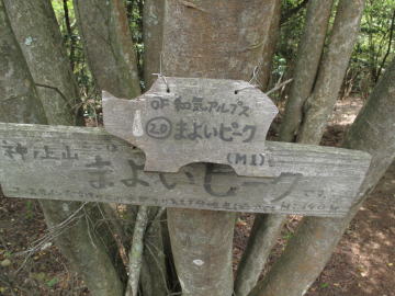 神ノ上山を後にするといよいよピークハント21のクライマックスが近づき、二つのピークを残すだけとなった。 まよいピークは以前多くの登山者に恐れられた樹海のピークだったようだが、今では何となく通り過ぎてしまうほど整備されている。 事実、このプレートに気がつかず再びこのピークに戻って写真を撮ることになってしまった。 |