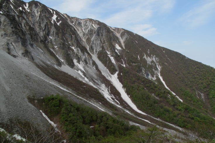 | 元谷ケルンから大山北壁を見上げる。 新緑の大山を満喫した一日だった。 さて、次はサラサドウダンが咲く那岐山を歩いてみようかな。 |