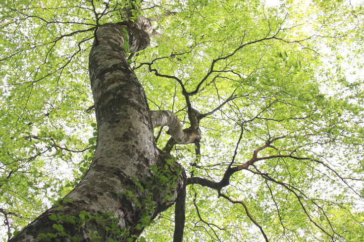 見上げれば芽吹いたばかりのブナの緑が朝日に透けて鮮やかだ。
