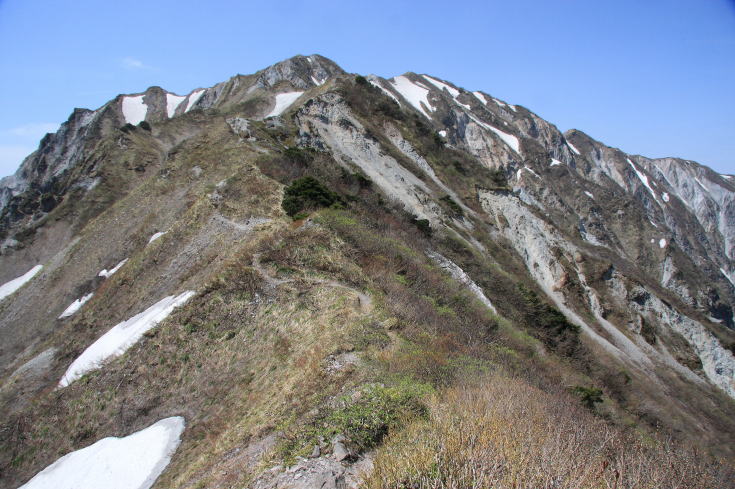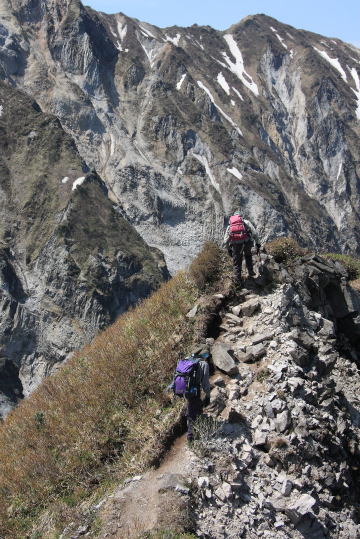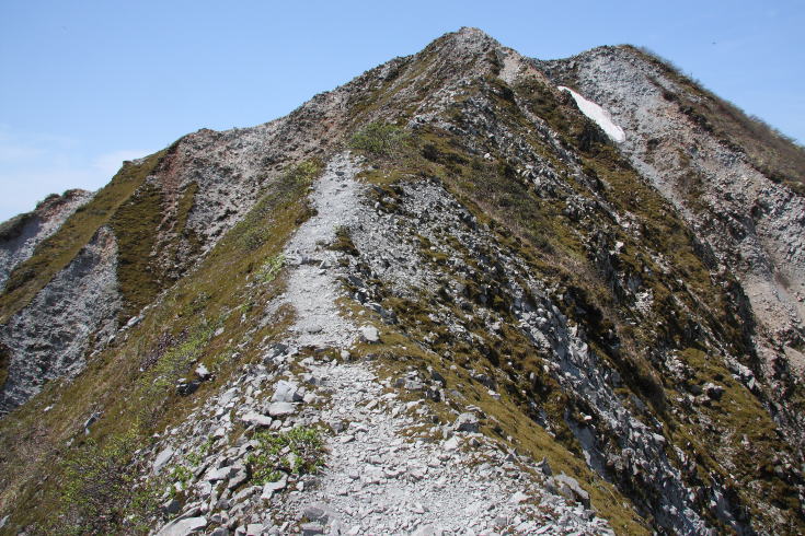 | 両側が切れ落ちた槍ヶ峰に続く縦走路。 | |||||