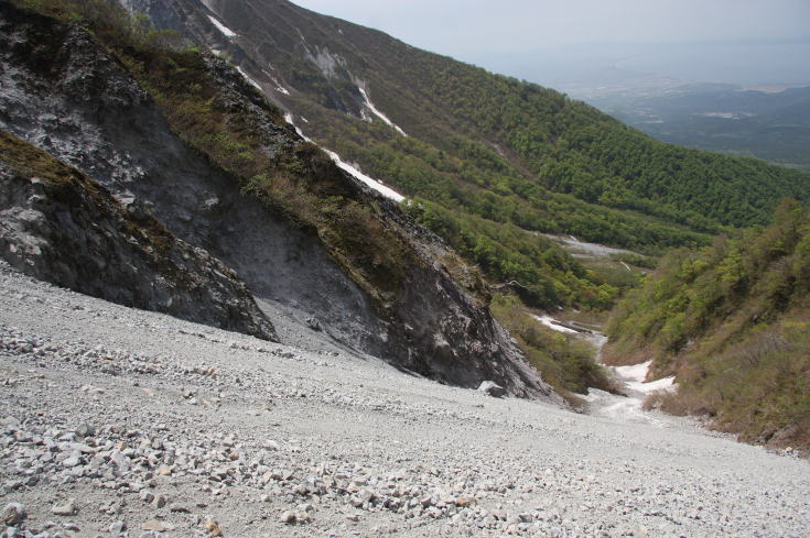 | 下山時、落石の音が少し落ち着いていたので思い切って砂滑りに降り立ってみると、状態は思っていた以上に良かった。 それでも時折大きな石がバウンドしながら落ちてくるので気が抜けない。 |