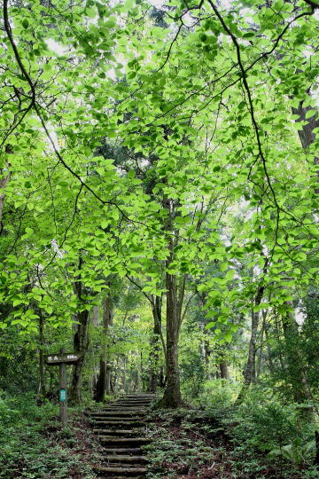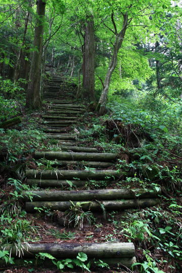 延々と続く新緑の東仙コースの階段を一気に駆け下りる。 (このコースは登りに使うとけっこうキツイです。) |