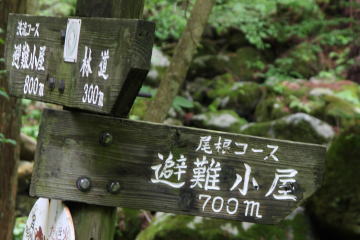 林道を400〜500m進むと西仙コース入り口の道標があり 登山道に入る。さらに約300m進むと登山道はふた手に分岐する。 どちらのコースも馬ノ背小屋で合流するのでお好きな方へ・・・。 |