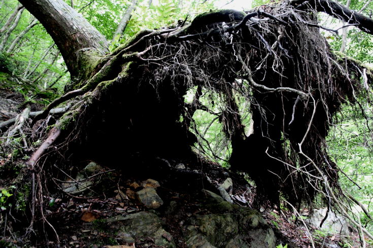 尾根コースに進むと数年前の台風で倒れたと思われる杉の巨木が横たわっている。 根っこの下に入れば大人数名が雨宿りできそうだ。 やがて登山道は急傾斜となり鎖場を迎える。 この辺りは春先にイワウチワの群生が見られるお勧めポイントだ。 |