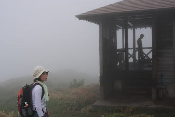 やがて馬ノ背小屋手前からガスに包まれ始めた。 慌てて先に進む必要もないので天気予報を信じて小屋で天候の回復を待つが、