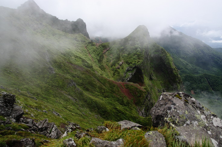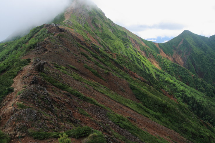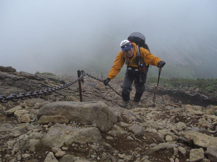 赤岩ノ頭手前から次第に傾斜がきつくなってきた。 おまけに風が非常に強くなりガスも立ち込めはじめた。 |