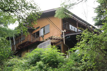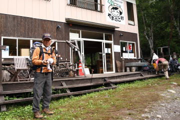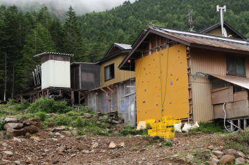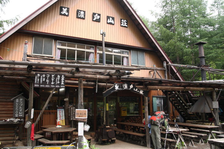 登山口となる美濃戸最奥に建つ「美濃戸山荘」 瓶ビール700円、缶ビール(350ml)400円の看板の誘惑に負けそうになるが、これからの道のりを考えて二人ともグッと我慢する。 |