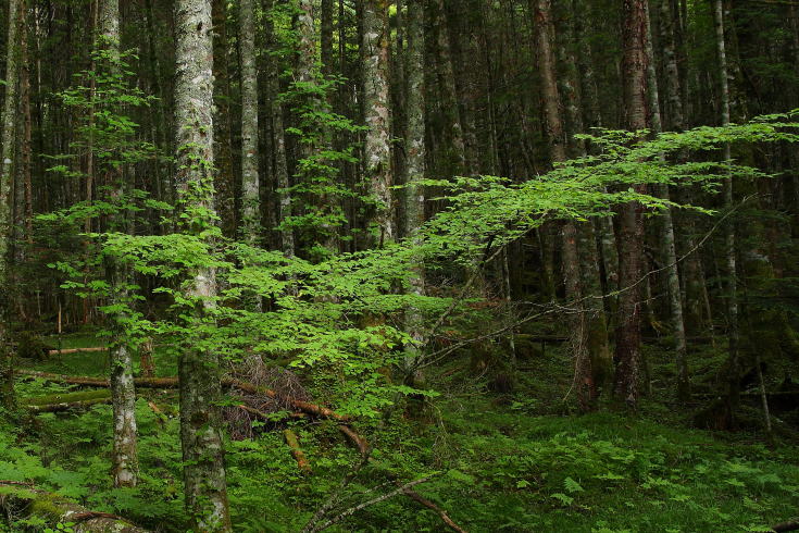 美しい深緑の森の中に伸びるゆるやかな登山道をひたすら進む。 |