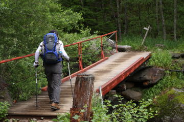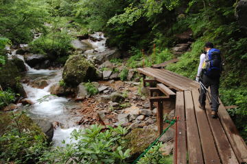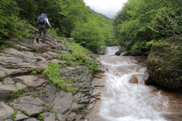 渓流沿いを進む。 どんよりと曇ってはいるものの心配していた雨は今のところ大丈夫のようだ。 |