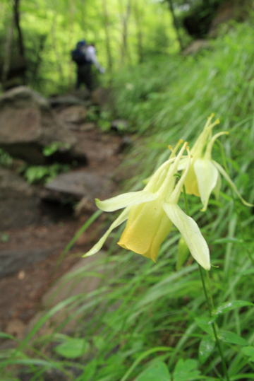 山荘からしばらく行くと林道は二つに分岐し、北沢コースに進路をとる。 この辺りから登山道らしくなり、登山道の脇にはヤマオダマキが咲いていた。 |