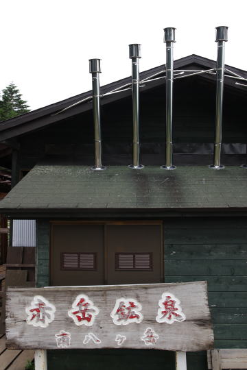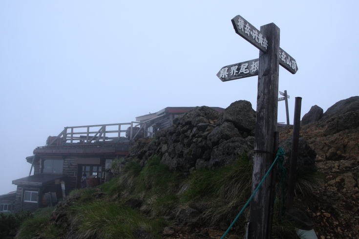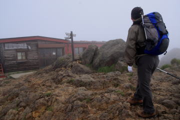 広々とした硫黄岳山頂付近ではこのようにガスっていると方向を誤ってしまいやすく要注意だ。 しかしケルンが等間隔で建てられていて登山者を道迷いから守ってくれていることをはじめて知った。 深く立ち込めたガスの中をケルンに導かれながらようやく硫黄岳山荘に到着した。 (AM11:48) 山荘では薪ストーブが焚かれていた。 真夏とはいえ3,000m級の山小屋ではこうしてストーブが焚かれることがあるのだ。 山荘の中では今日の山歩きをあきらめて駆け込んだ登山者が多数見受けられた。 すでに祝宴?をはじめているグループさえあった。 山荘で持参したコンビニ弁当をいただき天候の回復を待つことにした。 いくら待っても回復の兆しはなく、先ほどにも増して外ではビュービューと猛烈な風が吹き荒れている。 いつまでもここで時間をつぶすこともできず、重い腰を上げなければならなかった。 (PM12:30) |