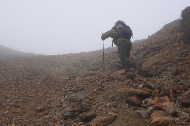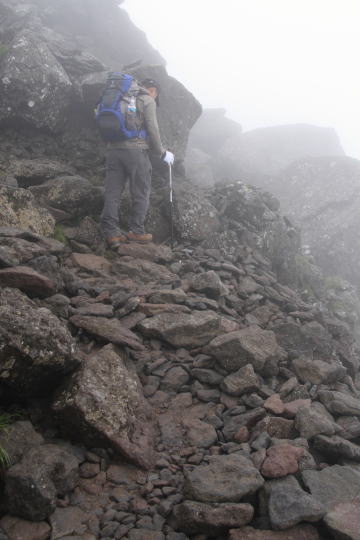 森林限界に達し、緑のない荒々しい岩稜の登山道を足場を確かめながら進む。 |